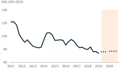 根據(jù)世界銀行的預(yù)測,飲料價格指數(shù)在2019年下降5%之后,預(yù)計2020年將上升2%。世界銀行在11月將飲料價格的經(jīng)濟(jì)預(yù)測進(jìn)行了上調(diào),并預(yù)測下降趨勢將在2020年穩(wěn)定下來。世界銀行飲料指數(shù)